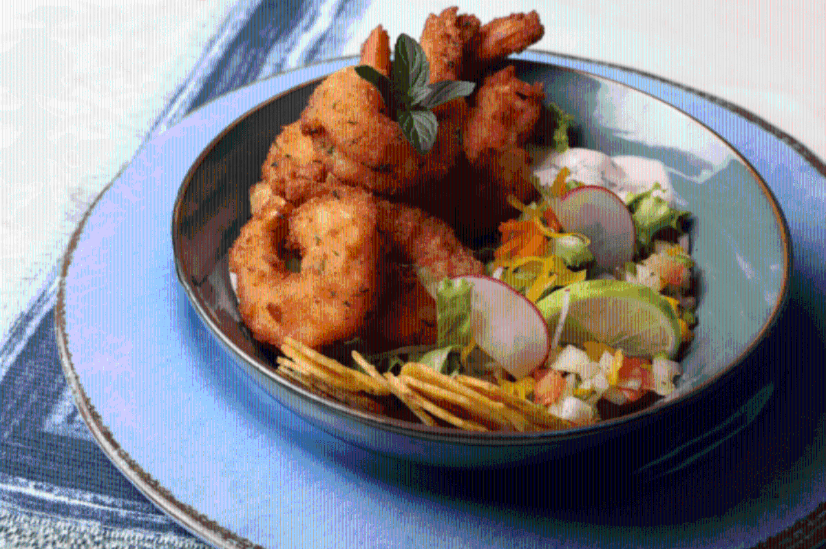 5/ Colocar los camarones empanizados en un bol, con la ensalada primavera, las tajaditas fritas de plátano, chismol y el aderezo de mayonesa y perejil.