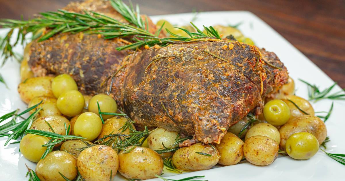 6. Precalentar el horno a 350°F. En un molde para horno añadir el vino blanco y 2 cucharadas de mantequilla amarilla, colocar el rollo de milanesa y las ramitas de hierbas frescas, tapar con papel aluminio y hornear durante 25 minutos.