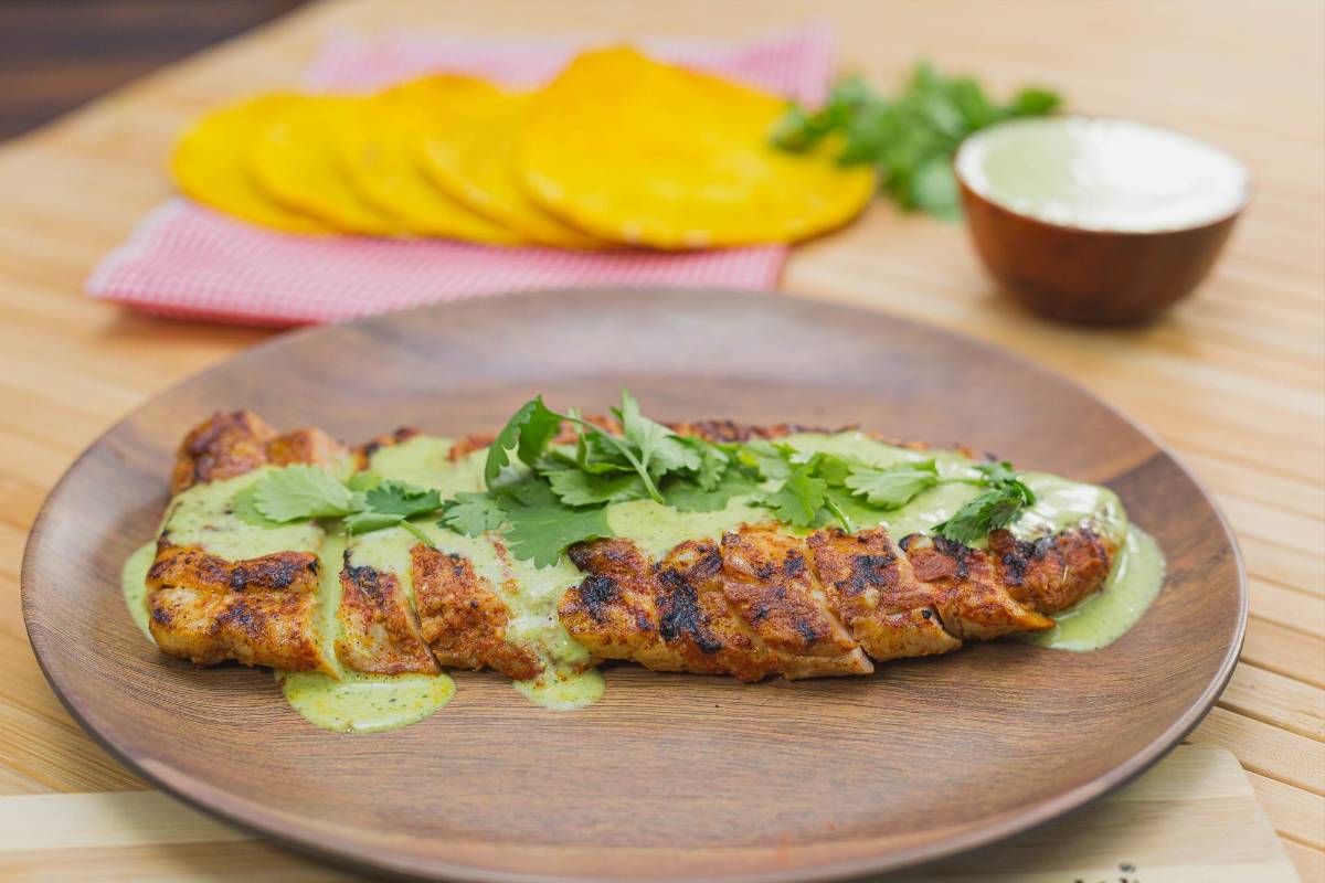 3/ Para la salsa, licuar o procesar el cilantro y el jalapeño junto a los ajos, jugo de piña. Ir agregando poco a poco el aceite de oliva hasta obtener una mezcla homogénea. Integrada ya la salsa, salpimentar al gusto.