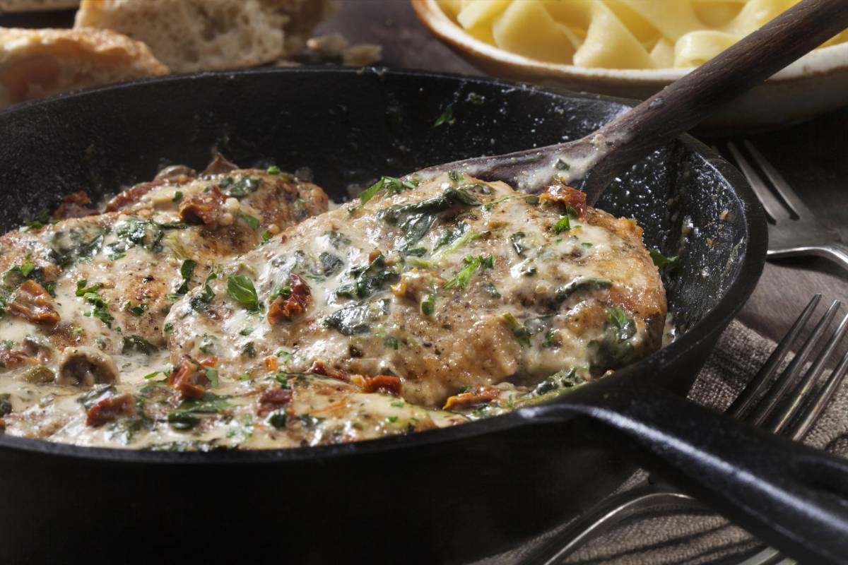 POLLO TOSCANO EN CREMA DE PARMESANO CON ESPINACAS Y TOMATES SECOS