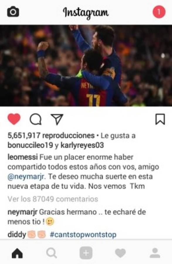 Horas después, Ney se encargó de responder al post del argentino: 'Gracias, hermano... te echaré de menos, tío', puso el ahora jugador del PSG (por confirmarse).