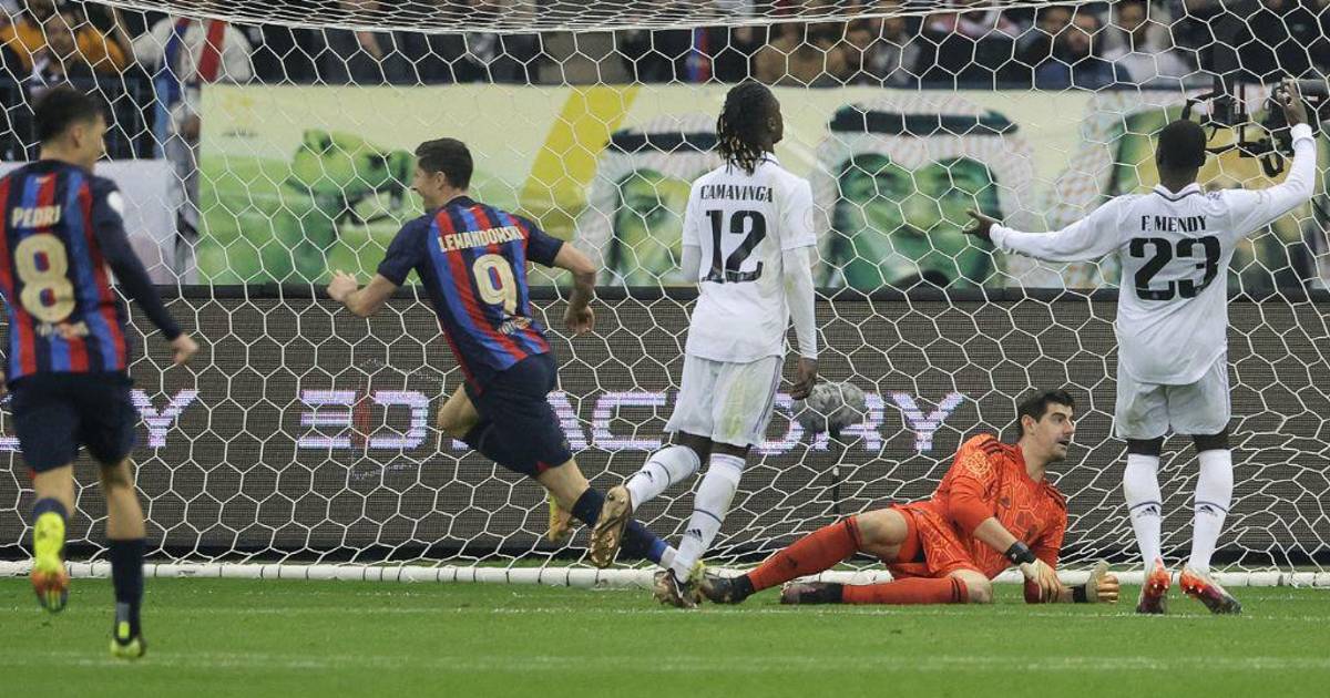 RIAD, ARABIA SAUDITA.- El delantero polaco Robert Lewandowski anotó el 2-0 del Barcelona sobre el Real Madrid y acaricia el título de la Supercopa de España, que se juega en el estadio King Fahd Stadium en Arabia Saudita.