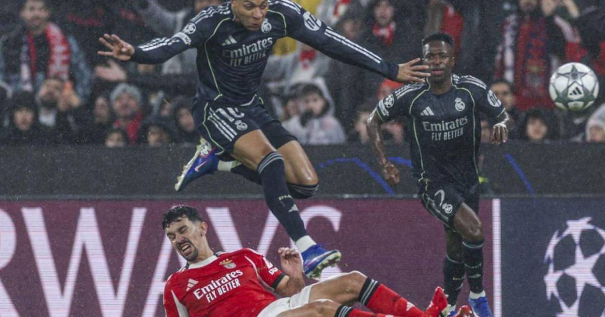 14': El Benfica llega con peligro al área del Madrid. Tras un rebote, el balón llegó a los pies de Prestianni que no alcanzó a rematar bien y terminó perdonando al cuadro merengue justo en un momento de debilidad defensiva.