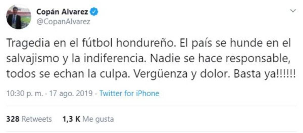 Copán Álvarez, quien laboró para Televicentro en Honduras, no escondió su molestia y condenó lo ocurrido. 'Tragedia en el fútbol hondureño. El país se hunde en el salvajismo y la indiferencia. Nadie se hace responsable, todos se echan la culpa. Vergüenza y dolor. Basta ya', dice el mensaje que publicó el comunicador en su cuenta de Twitter.