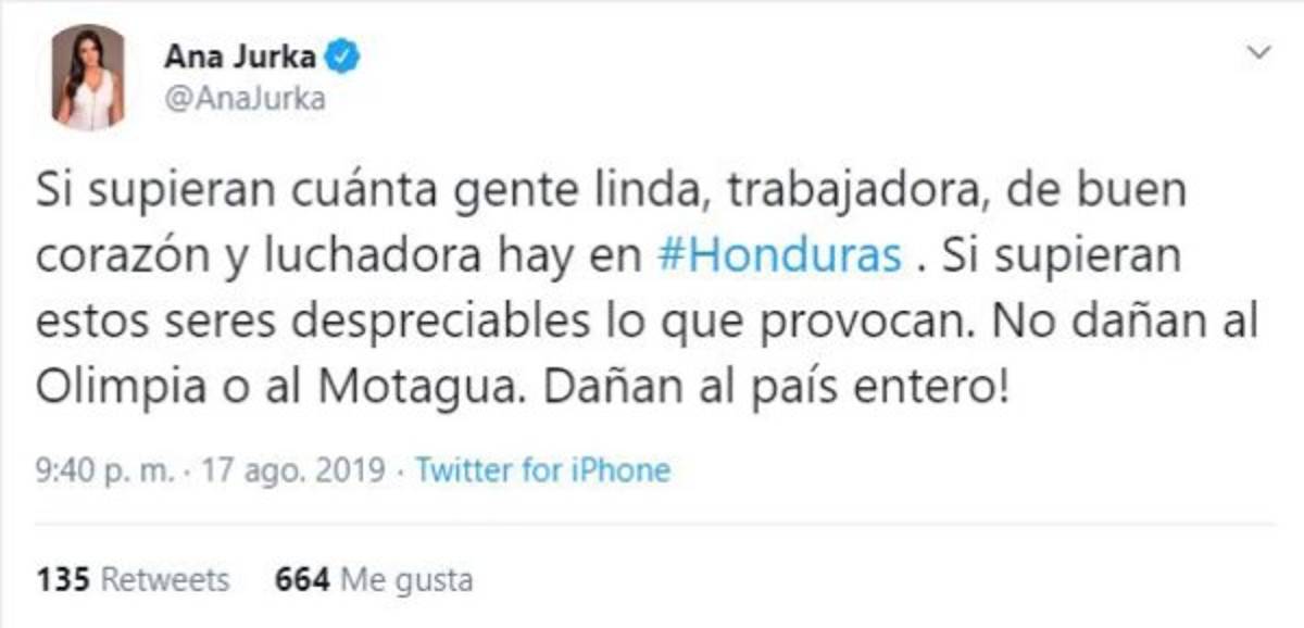 Por su parte, Ana Jurka también se valió de las redes sociales para exteriorizar su malestar. Jurka aseguró que con este tipo de incidentes el principal daño se lo hacen a Honduras. 'Si supieran cuánta gente linda, trabajadora, de buen corazón y luchadora hay en Honduras. Si supieran estos seres despreciables lo que provocan. No dañan al Olimpia o al Motagua. Dañan al país entero', fue el mensaje que escribió la hondureña en redes sociales.