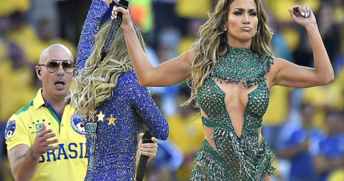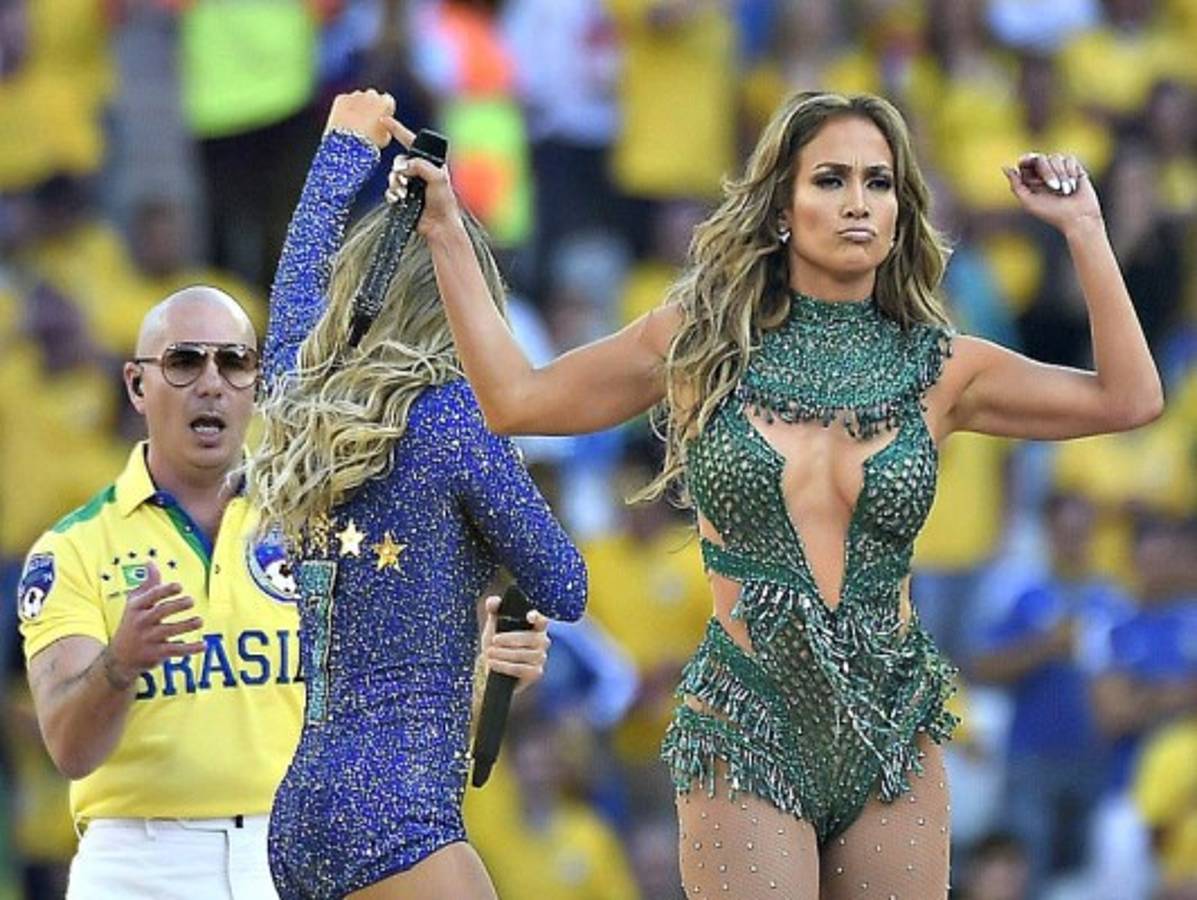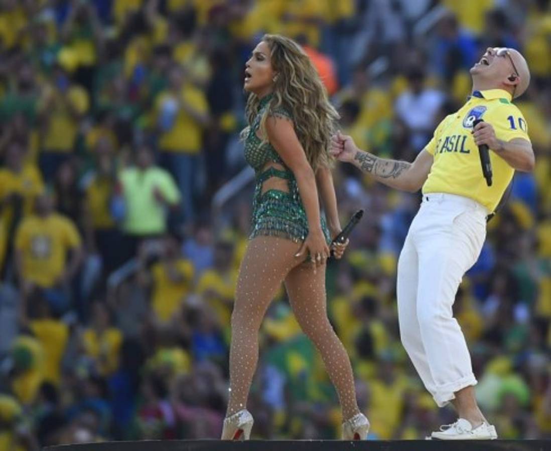 Vestidos de los colores nacionales verde y amarillo, Jennifer López y Pitbull interpretaron el himno oficial de la Copa del Mundo previo al partido inaugural del torneo cuya final se disputará el 13 de julio en Río de Janeiro.