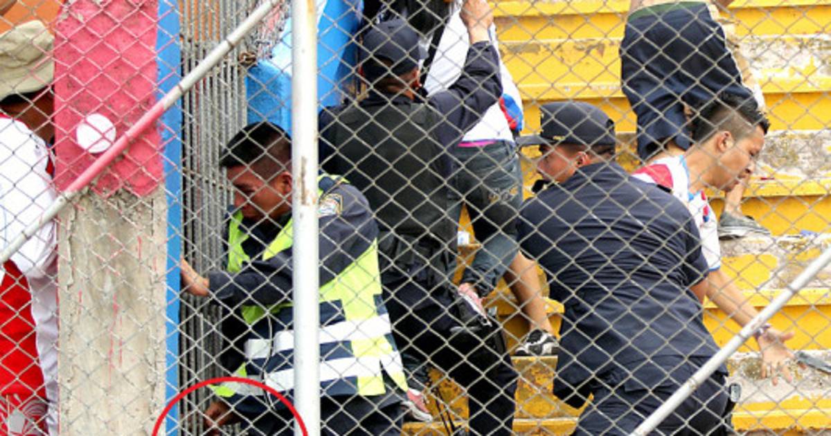 Unas gráficas muestran el momento en el que le roban el arma a uno de los agentes agredidos el sector sur del estadio Nacional durante el partido entre Olimpia y Platense (0-0), que le dio el pase a la final a los Leones. (Ver más fotos de la agresión)