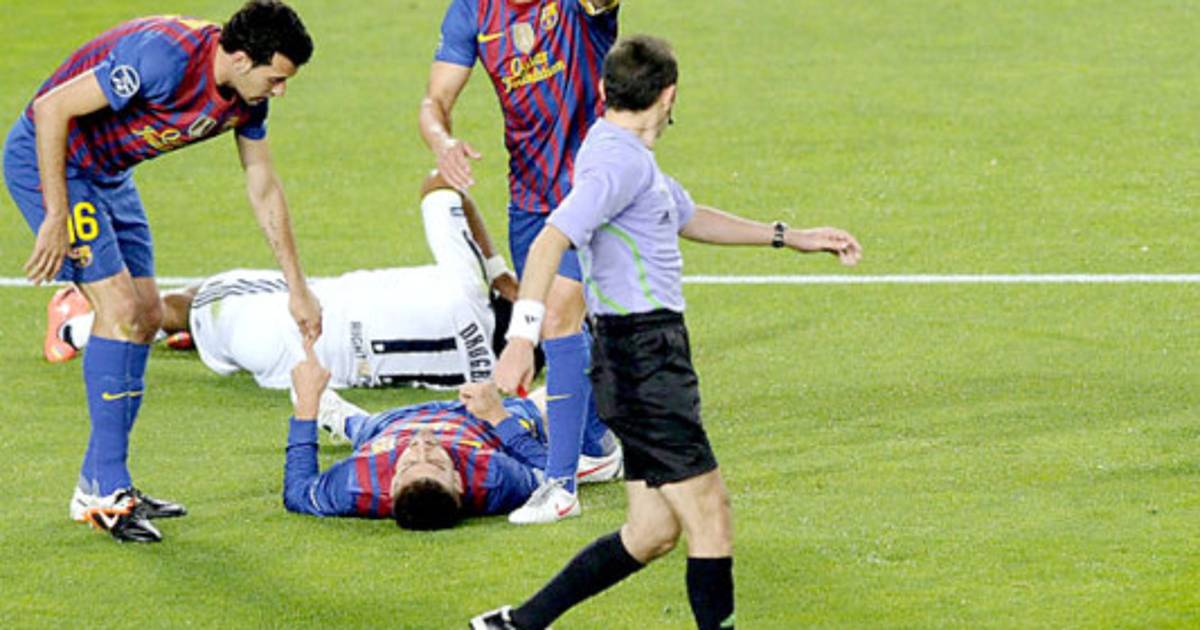 Corría el minuto 16 cuando el jugador catalán calló desplomado al terreno de juego luego del caderazo de Valdés en una pugna por hacerse con el balón ante el peligro de Didier Drogba.