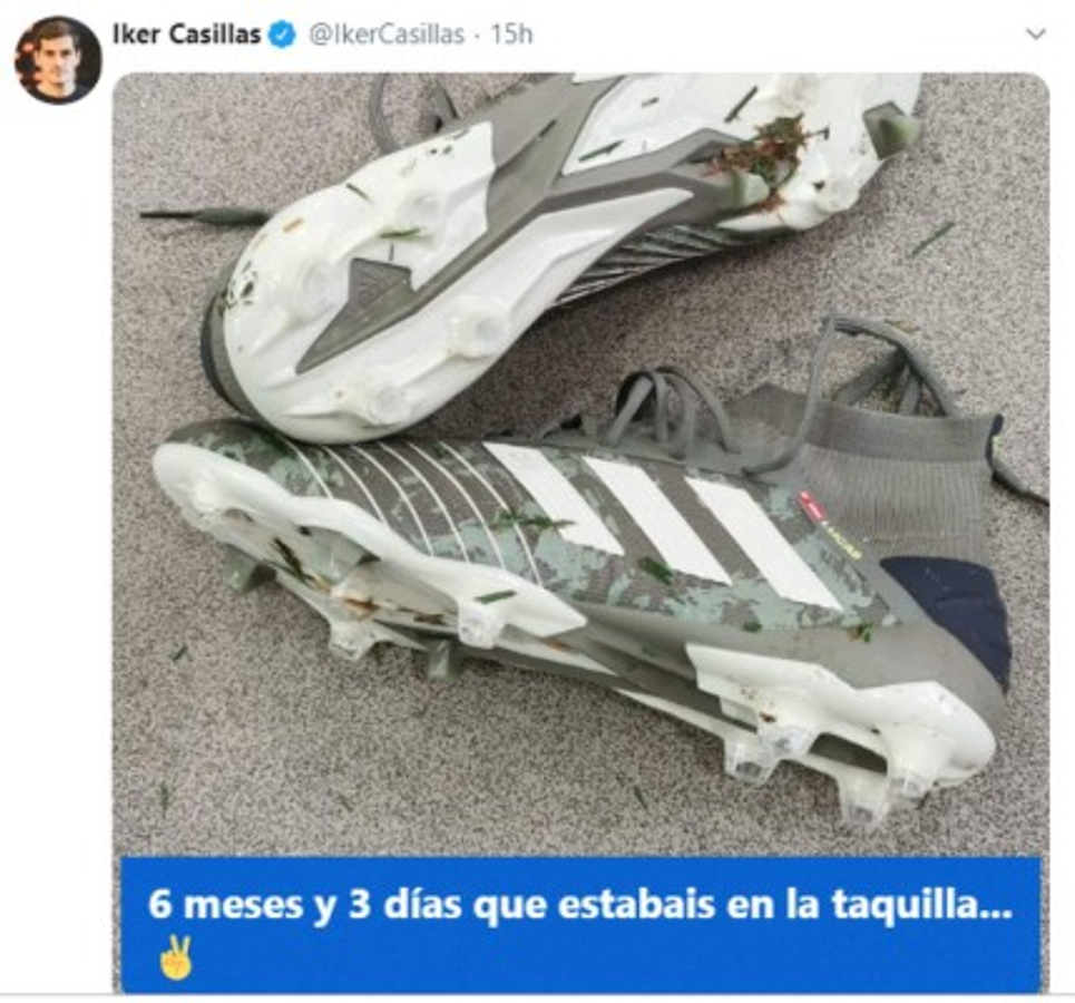 '6 meses y 3 días que estabais en la taquilla...', escribió Casillas acompañando una foto de unas botas de fútbol.