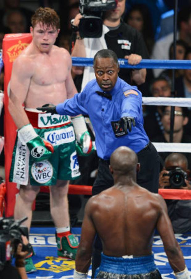 En su frustración, el mexicano conectó varios golpes bajos, no intencionales, en un intento por machacar el elusivo cuerpo de Mayweather.