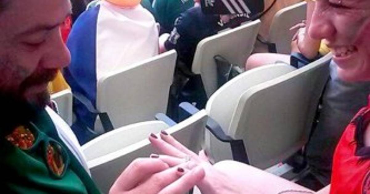 El hombre decidió ponerse de rodillas, '¿quieres casarte conmigo?' le preguntó a su novia; y justo cuando ella responde que “sí”, cae el gol de Sneijder que empató el encuentro.