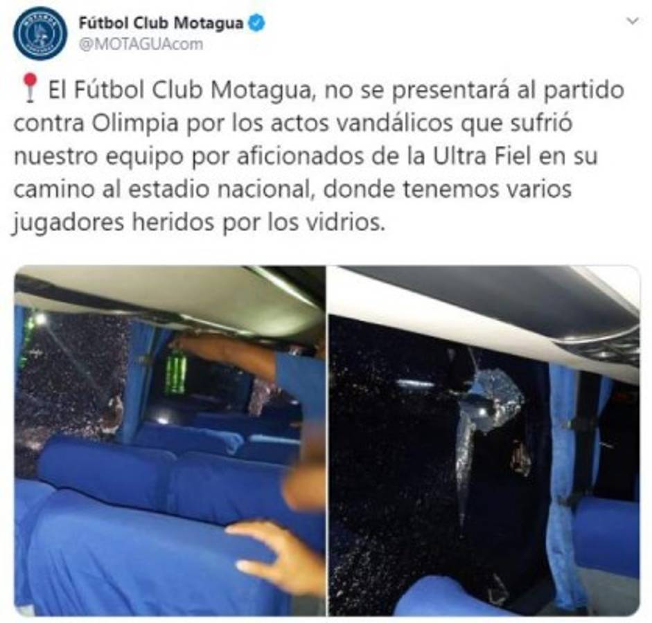 'El Fútbol Club Motagua no se presentará al partido contra Olimpia por los actos vandálicos que sufrió nuestro equipo por aficionados de la Ultra Fiel en su camino al estadio nacional, donde tenemos varios jugadores heridos por los vidrios'.