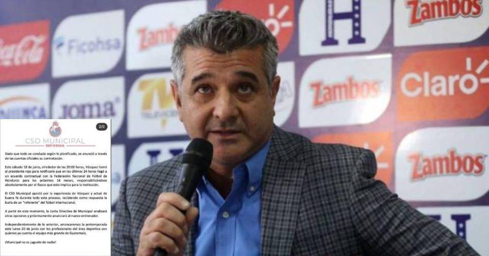”Desde el pasado martes 7 de junio, el presidente de Municipal, Gerardo Villa, se comunicó con Vázquez para acordar los términos de su contratación. En aquel momento, el estratega se mostró anuente e interesado en dirigir al cuadro carmesí. Se definió de mutuo acuerdo que su llegada sería anunciada al finalizar su participación interina con la Selección de Honduras en la Liga de Naciones de la Concacaf. Un día después, el 8 de junio, le fueron enviados los boletos para su arribo a Guatemala”, dice en primera instancia el comunicado.