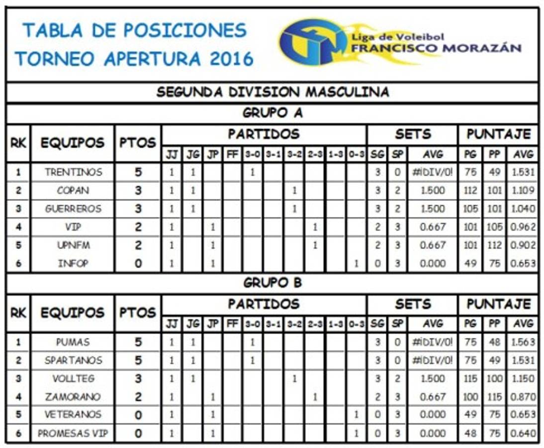 La segunda división masculina, que cuenta con un mayor número de equipos participantes, en el grupo 'A' en la cima de la tabla se coloca Trentinos al vencer 75-49 a INFOP, por otra parte en el grupo 'B', Pumas encabeza la tabla al derrotar 75-49 a Promesas VIP.