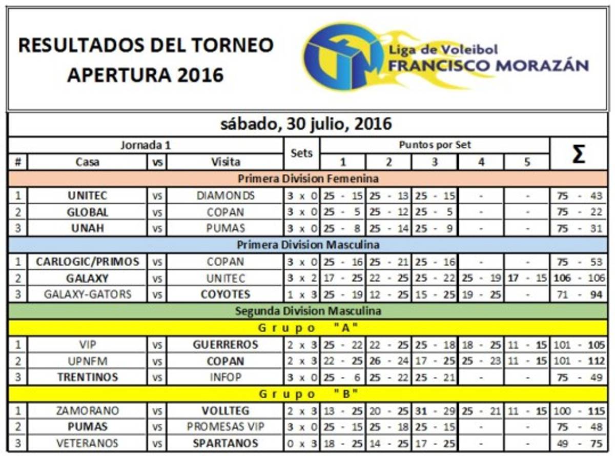 En la primera división femenina se coloca el equipo de Global en la primera posición por un resultado total de 75-22 contra Copán.