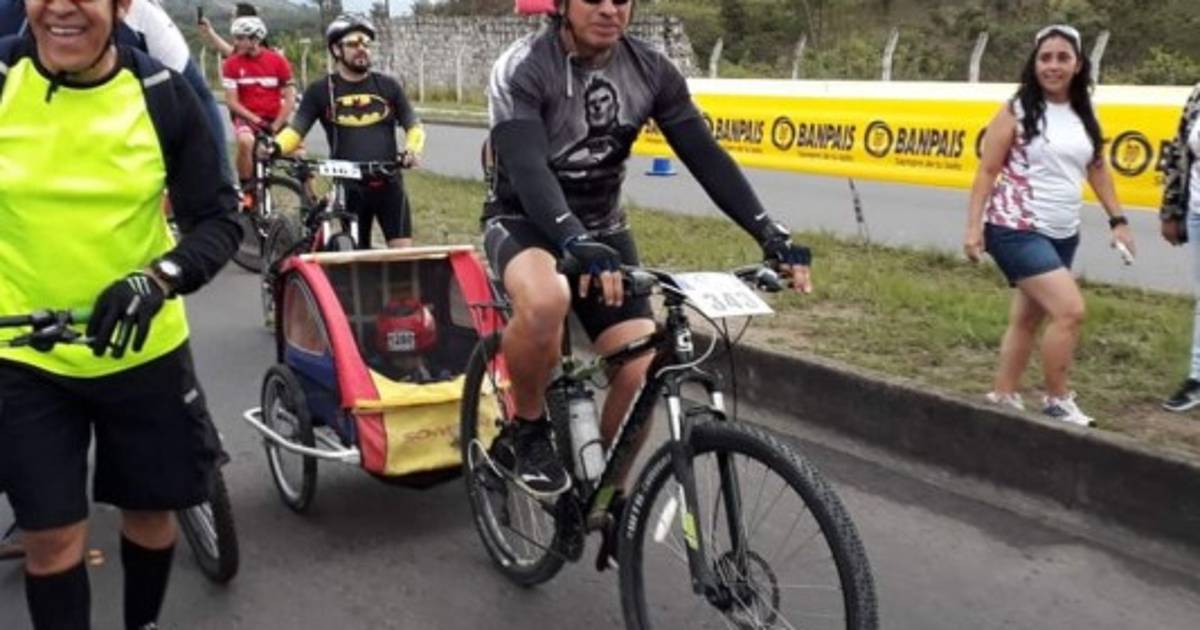 Arrastrando el coche de su pequeño Ariel, mientras el publico aplaudía, el papá se propone ser el ganador en la categoría Master B de esta séptima edición.