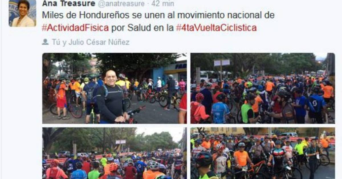 'Miles de Hondureños se unen al movimiento nacional de #ActividadFisica por Salud en la #4taVueltaCiclistica', publicó en su cuenta oficial de Twitter, Ana Treasure.