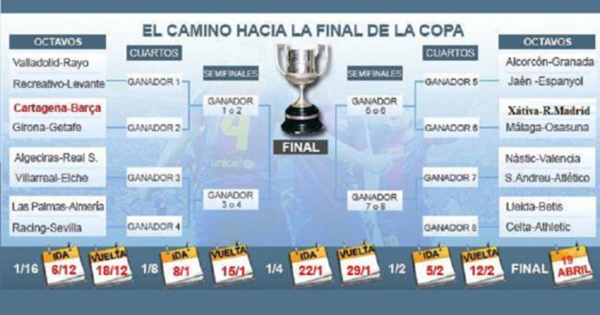 El sorteo se realizó en el Vicente Calderón, estadio del Atlético de Madrid, actual campeón. De ganar todos sus partidos en todas las rondas, Barça y Real Madrid se encontrarán en la final.