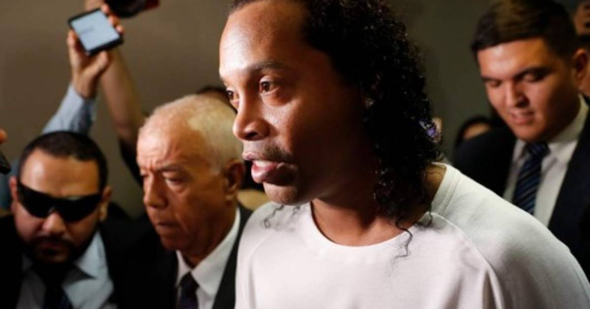 El jugador de 39 años y su hermano Roberto Assis fueron arrestados la noche del viernes en un hotel de la capital de Paraguay. Ambos aparecieron el sábado esposados y Ronaldinho trataba de ocultar las esposas bajo un trozo de tela lila.