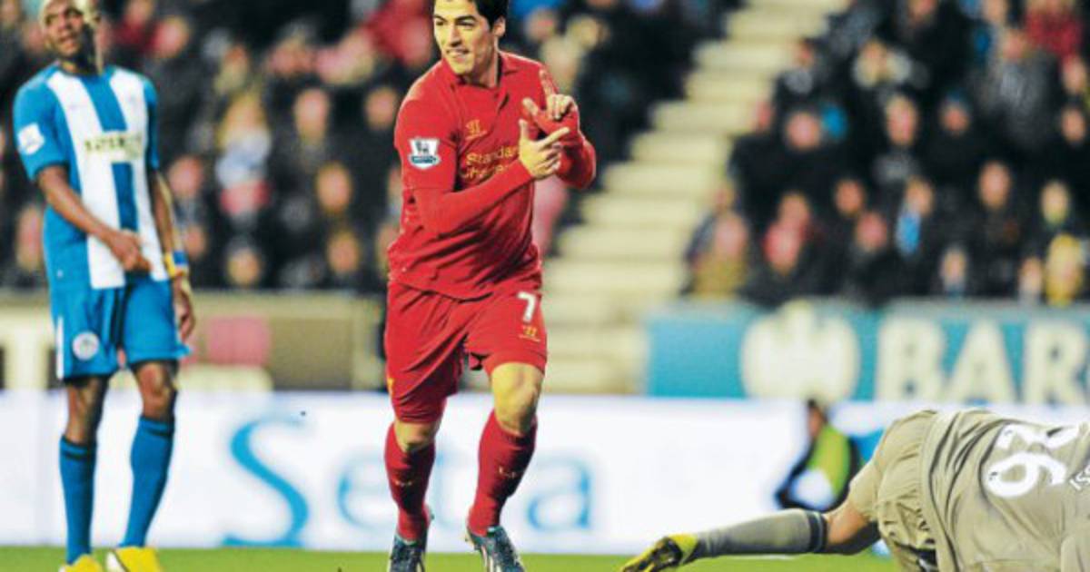 Luis Suárez marcó un triplete en el triunfo 4-0 de Liverpool ante Wigan en la fecha 28 de la Premier League inglesa, donde Manchester United es líder absoluto con 71 puntos.