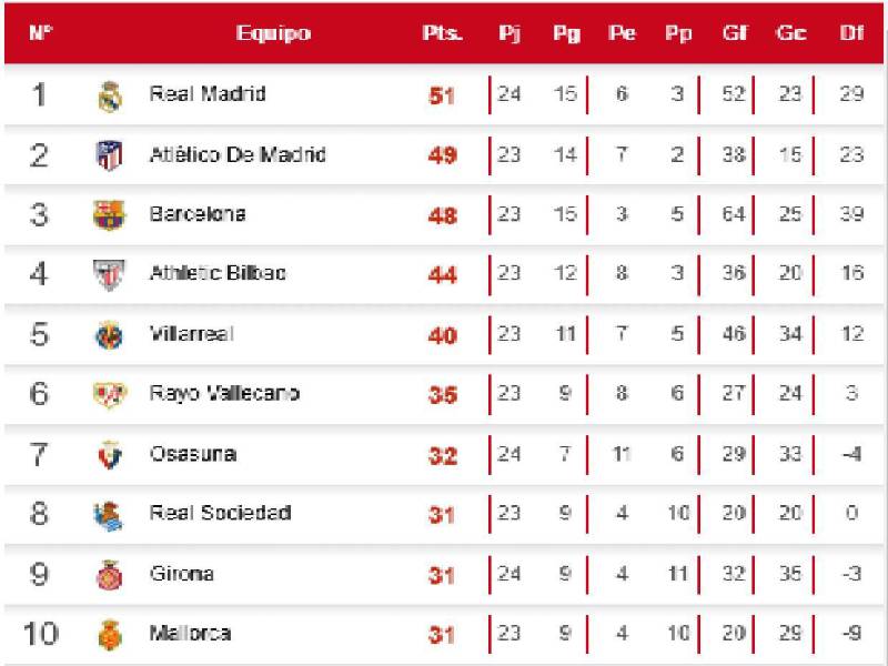 Con este resultado, el equipo blanco queda en la cima con 51 puntos, pero el Atlético de Madrid podría superarlo si logra un triunfo ante el Celta de Vigo porque llegaría 52 unidades.