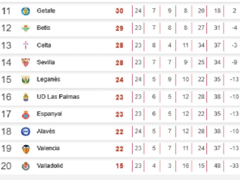 En los puestos del descenso están Real Valladolid con 15, Alavés y Valencia con 22 unidades