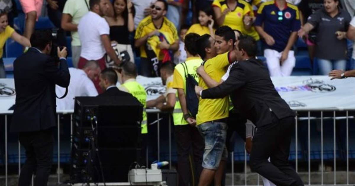 La presentación del jugador de 23 años desató la euforia entre los hinchas presentes –muchos de ellos con la camiseta de la selección colombiana-, aunque esta desbordó en dos aficionados de Rodríguez, quienes saltaron las gradas e invadieron el campo para abrazar al nuevo crack del Real Madrid.