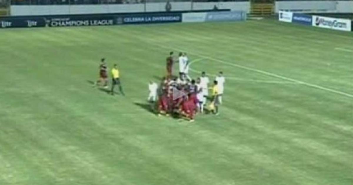 Los jugadores de los dos equipos de inmediato armaron la bronca en la cancha del Estadio Nacional de Tegucigalpa y el árbitro central tuvo que intervenir.