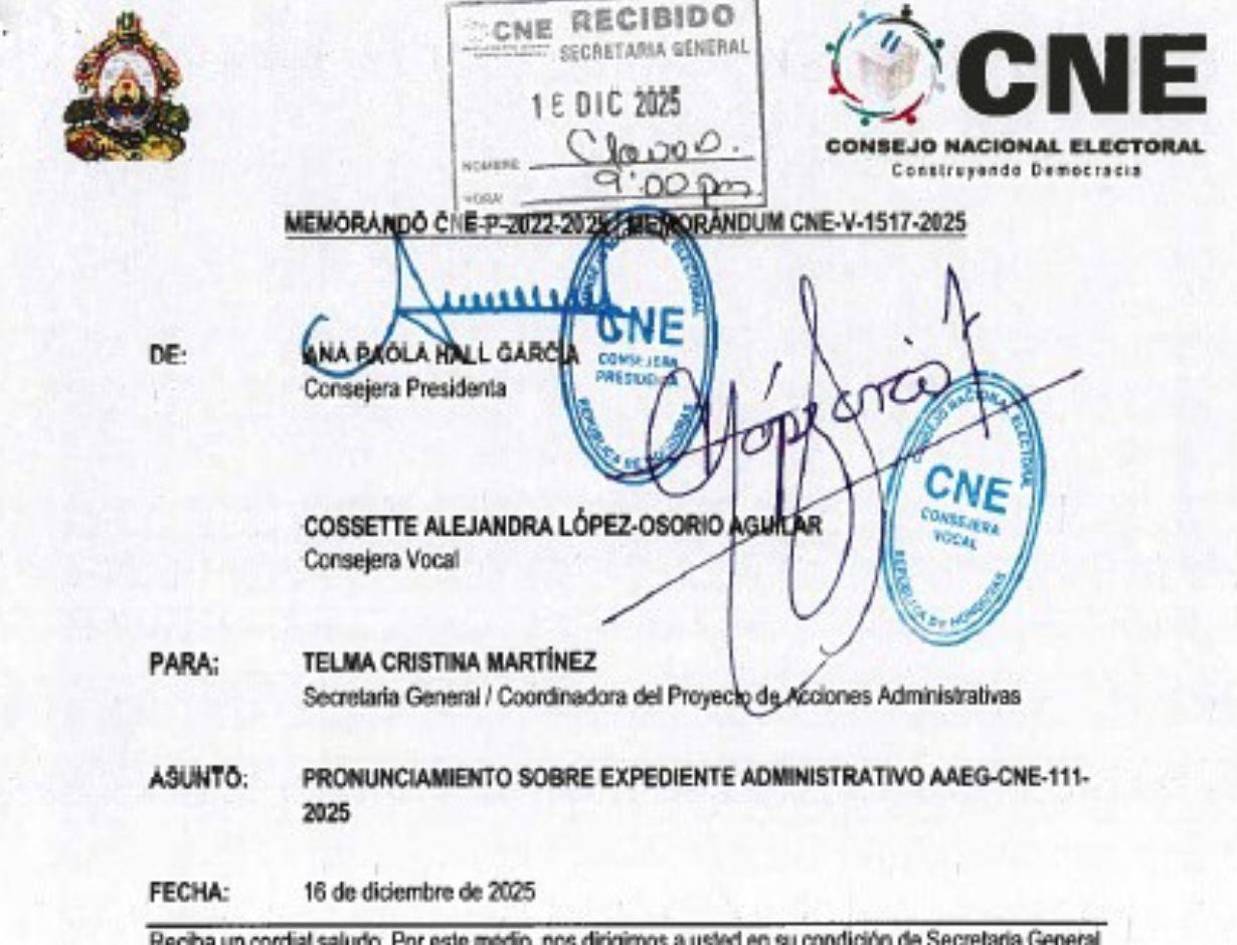 Memorado del CNE en el que descarta un conteo de voto por voto