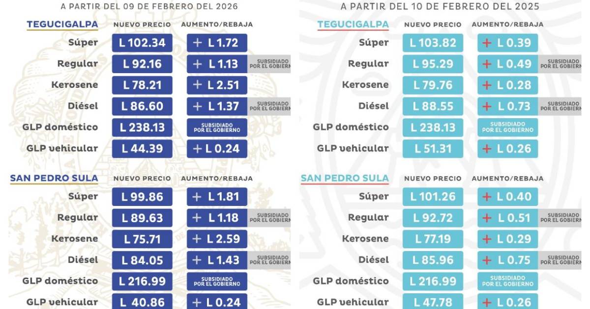 En el caso de la gasolina superior de 95 octanos para la segunda semana de febrero se cotiza a 102.34 lempiras, no así en el 2025 cuando ascendió a 103.82 lempiras, 1.48 lempiras adicionales.