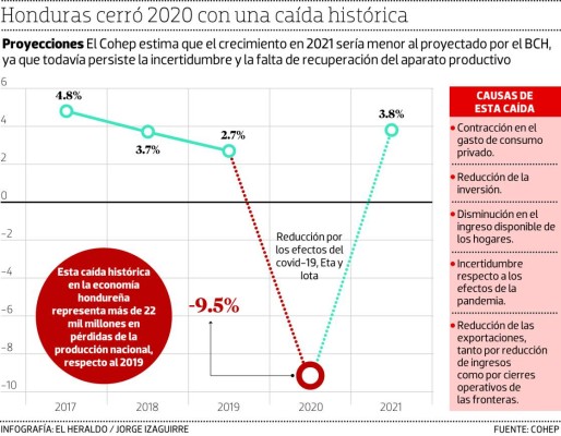 TEGUCIGALPA, HONDURAS.- Las perspectivas económicas siguen siendo desalentadoras este año, pese a que había una esperanza muy grande de que la pandemia pasara y se lograra un 2021 de una pujante reactivación. No obstante, de acuerdo con un informe del Consejo Hondureño de la Empresa Privada (Cohep), la economía estaría creciendo menos del 3.8% que proyecta el Banco Central de Honduras (BCH) para este año. Significa que solo habrá una recuperación, como efecto rebote, de parte de la actividad productiva del país, después de una caída de 9.5%.