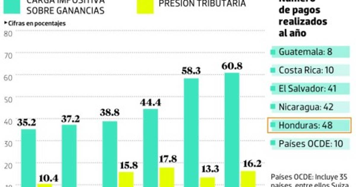 Así lo revela un estudio comparativo de la Federación de Cámaras de Comercio del Istmo Centroamericano (Fecamco). “En promedio, las compañías de Centroamérica pagan un 45.8% de impuestos, mientras que en los países OCDE pagan 40.9%”, precisa el informe. En Honduras, específicamente, la carga impositiva representa el 44.4% de las ganancias de las empresas.