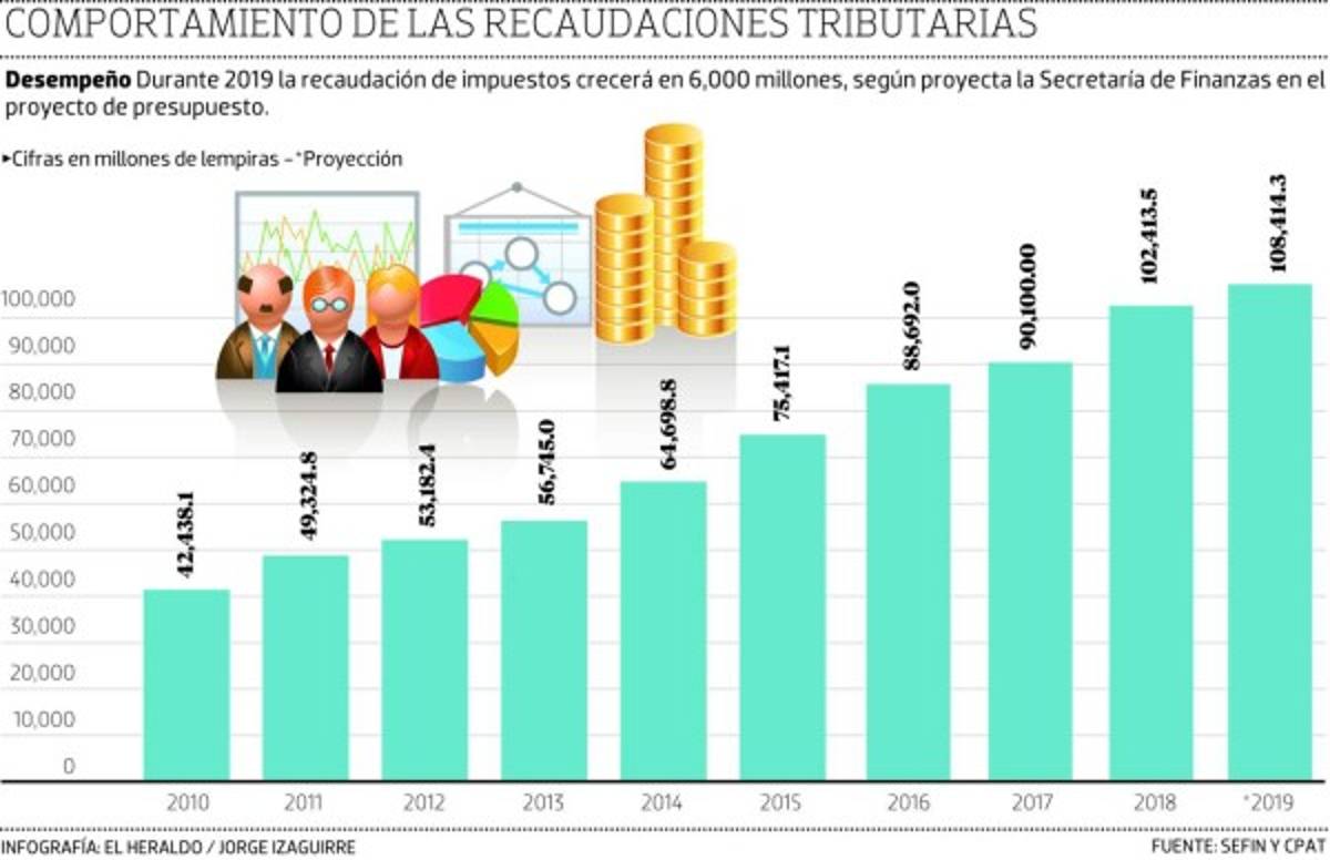 TEGUCIGALPA, HONDURAS.- Los hondureños contribuirán al fisco con 108,414.3 millones de lempiras en impuestos durante 2019, de acuerdo con la meta establecida en el proyecto de presupuesto.