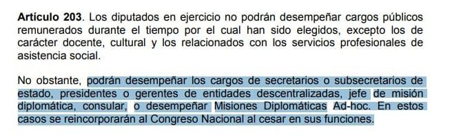 El artículo 203 de la Constitución de la República establece bajo qué circunstancia los diputados en ejercicio pueden renunciar. En el segundo párrafo de dicho artículo indica claramente que “podrán desempeñar los cargos de secretarios o subsecretarios de estado, presidentes o gerentes de entidades descentralizadas, jefe de misión diplomática, consular, o desempeñar Misiones Diplomáticas Ad-hoc”.