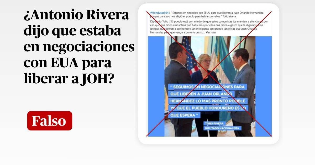 Una búsqueda en Google con palabras clave “Antonio Rivera + negociaciones + Estados Unidos + liberación + Juan Orlando Hernández” no arrojó resultados de la supuesta cita del congresista hondureño. Tampoco se halló información en los perfiles de redes sociales.