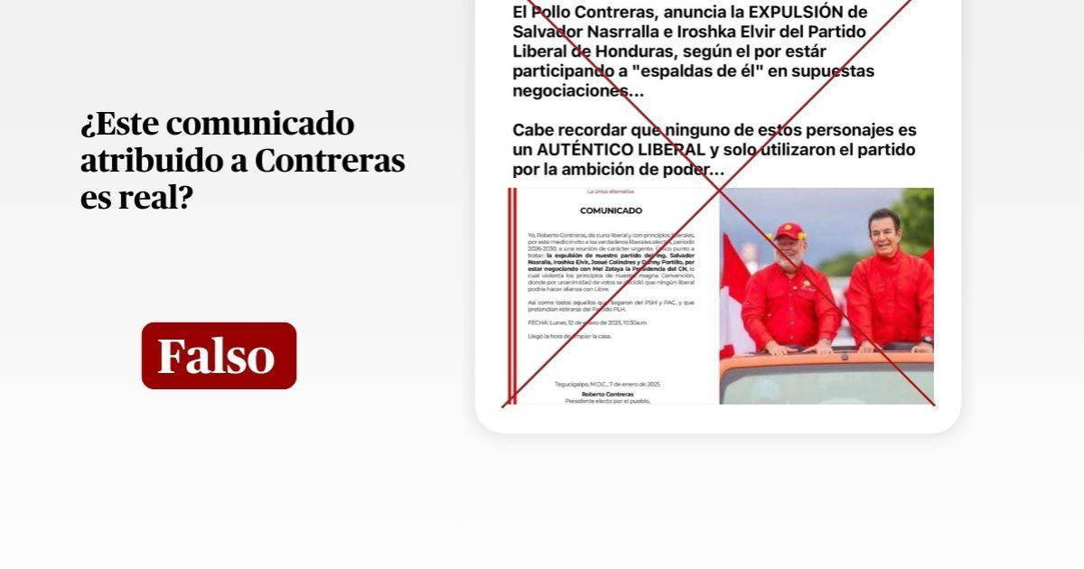 En conclusión, es falso el comunicado atribuido al Partido Liberal en el que se afirma que Contreras convocó a una reunión para expulsar a Nasralla, Iroshka y otras dos figuras.