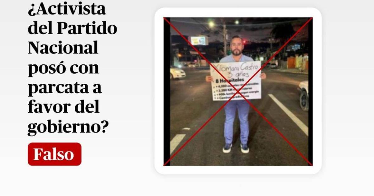 Por lo tanto, es un montaje la foto que muestra a Mario Díaz, activista del Partido Nacional, con una pancarta que destaca la gestión de Xiomara Castro.
