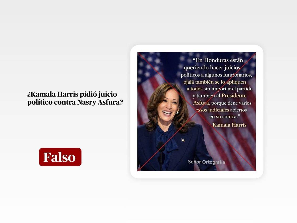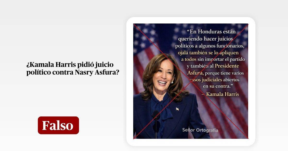 Tegucigalpa, Honduras.- Circula en redes sociales una publicación que, mediante un arte, asegura que Kamala Harris, exvicepresidenta de Estados Unidos, solicitó un juicio político contra el mandatario hondureño Nasry Asfura debido a los casos judiciales abiertos en su contra.
