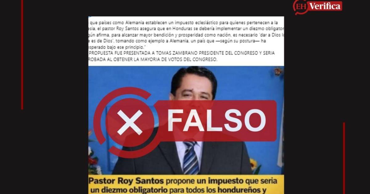 Además, no existen registros públicos que documenten que Roy Santos haya presentado una propuesta de ese tipo ante el Congreso Nacional. Tampoco hay evidencia de que el tema haya sido discutido con Tomás Zambrano ni de que exista un proyecto legislativo en trámite para imponer un diezmo obligatorio en Honduras.