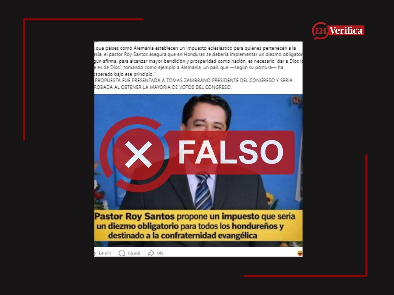 “Pastor Roy Santos propone un impuesto que seria un diezmo obligatorio para todos los hondureños y destinado a la confraternidad evangélica”, se lee literalmente en el texto sobrepuesto en la imagen difundida en Facebook, compartida más de 145 veces desde el 19 de abril de 2026.