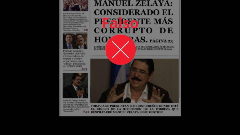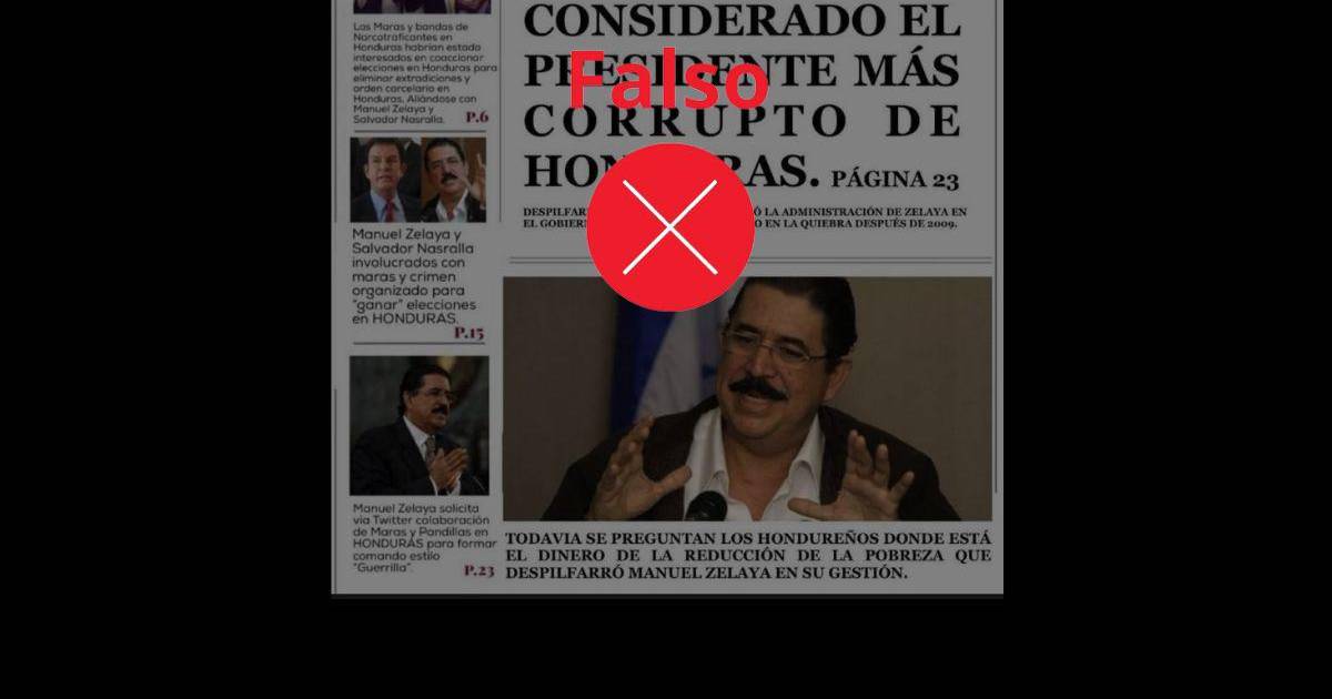“MANUEL ZELAYA: CONSIDERADO EL PRESIDENTE MÁS CORRUPTO DE HONDURAS. PÁGINA 23DESPILFARRO DE DINERO Y DEUDAS DEJÓ LA ADMINISTRACIÓN DE ZELAYA EN EL GOBIERNO DE HONDURAS, DEJÁNDOLO EN LA QUIEBRA DESPUÉS DE 2009”, dice la falsa nota principal, en donde también aparece una foto del asesor de la presidenta Xiomara Castro.