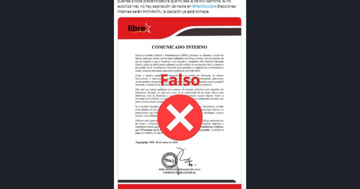 Sin embargo, desde el 20 de marzo de 2024 ha sido compartido decenas de veces un comunicado con el logo de Libre y la firma de su coordinador general, Manuel Zelaya, que dice que “hacemos un llamado” para “un apoyo irrestricto a la abogada Rixi Moncada para “presentar su candidatura a la presidencia”.
