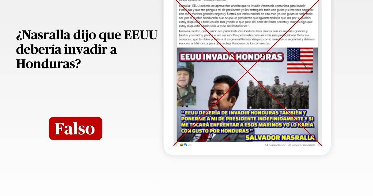 Tegucigalpa, Honduras.- En redes sociales circula una publicación que atribuye al candidato presidencial de Partido Liberal, Salvador Nasralla, una supuesta declaración en la que pide a Estados Unidos invadir Honduras y colocarlo a él como presidente de manera indefinida.