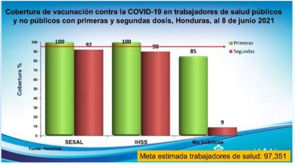 Mientras que el personal sanitario vinculado al IHSS también estaba cubierto en un 100% con la primera dosis, en tanto que la segunda dosis para este grupo había llegado a un 90%, señala el reporte.