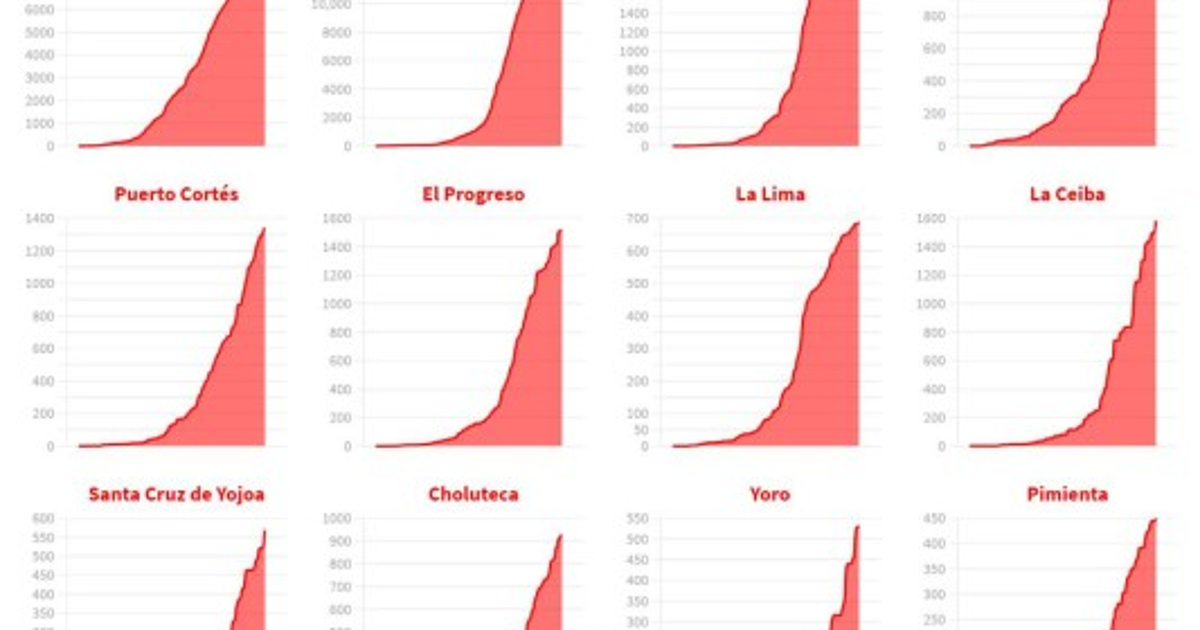 En el primer bloque está la curva de casos acumulados. Por defecto aparecen los gráficos de los diez de los municipios con mayor cantidad de enfermos, como Tegucigalpa y San Pedro Sula.