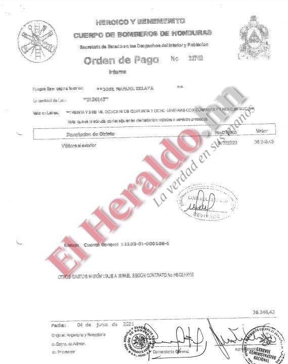 La orden de pago no. 32703 detalla que el comandante general del Cuerpo de Bomberos, José Manuel Zelaya, recibió 36,248.43 lempiras como viáticos al exterior.