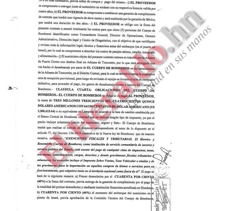 El documento reza que el proveedor se obliga con la firma del contrato a asumir totalmente los costos (de viaje) para cinco personas del Cuerpo de Bomberos, identificados como comandante general, director de operaciones, gerente administrativo, dirección legal y centro de diagnóstico.