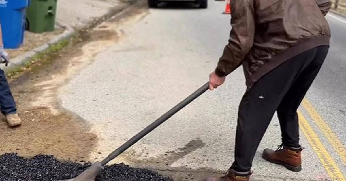 Schwarzenegger, con pala en mano, fue captado aplicando asfalto al agujero que se había ido formando frente a su entrada, que por cierto ya llevaba al menos tres semanas.
