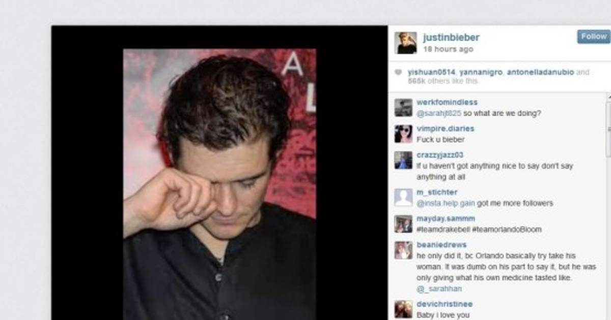 En la foto se lo ve a Bloom en una actitud de lloriqueo, como si hubiera sido humillado por el músico en el enfrentamiento que tuvieron en el restaurant Cipriani de Ibiza, la cual quedó registrada en un video casero de un testigo del violento hecho. En la grabación se observa cómo Bloom va en búsqueda de Bieber y le tira un puñetazo ante la vista de todo el personal de seguridad del cantante.