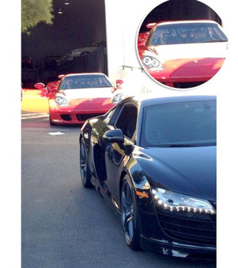 En la fotografía se ve al intérprete como copiloto del Porshe Carrera GT, vistiendo una camiseta negra y unos lentes de sol, sonriente.